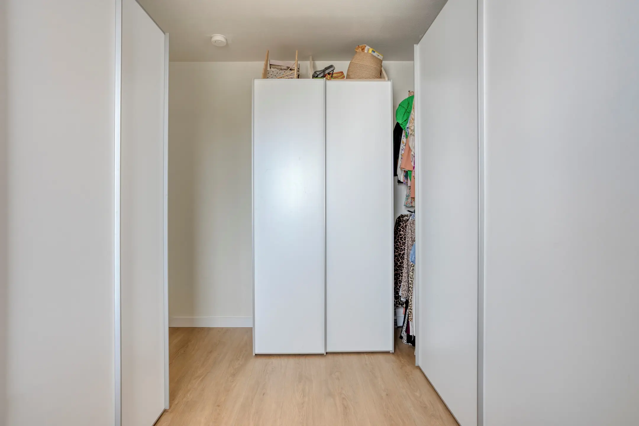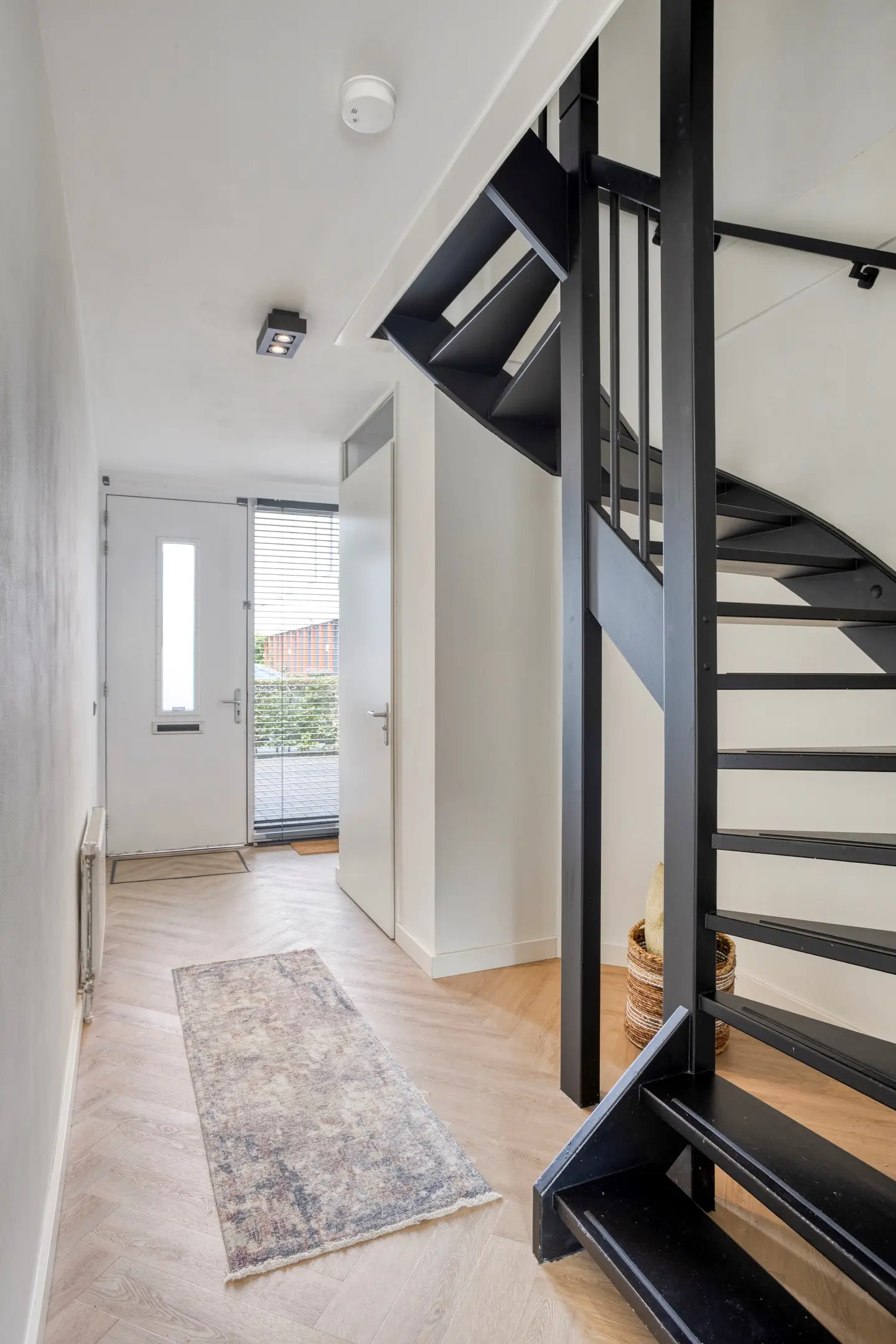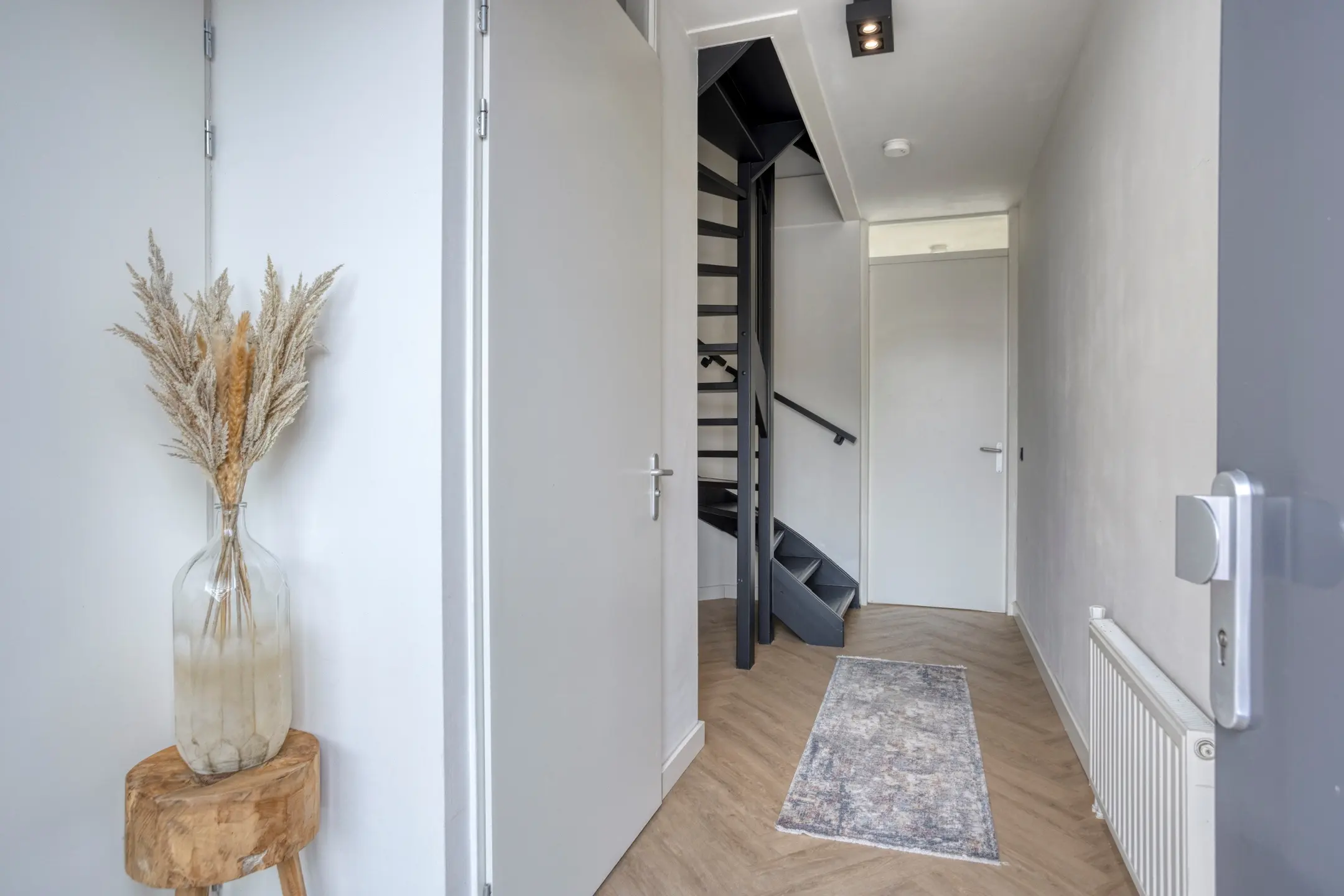 De wanden in de hal zijn strak gestuct en de vloer is afgewerkt met een visgraatvloer.