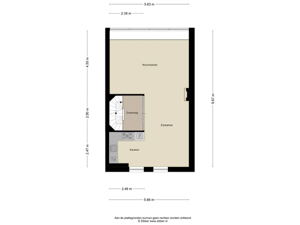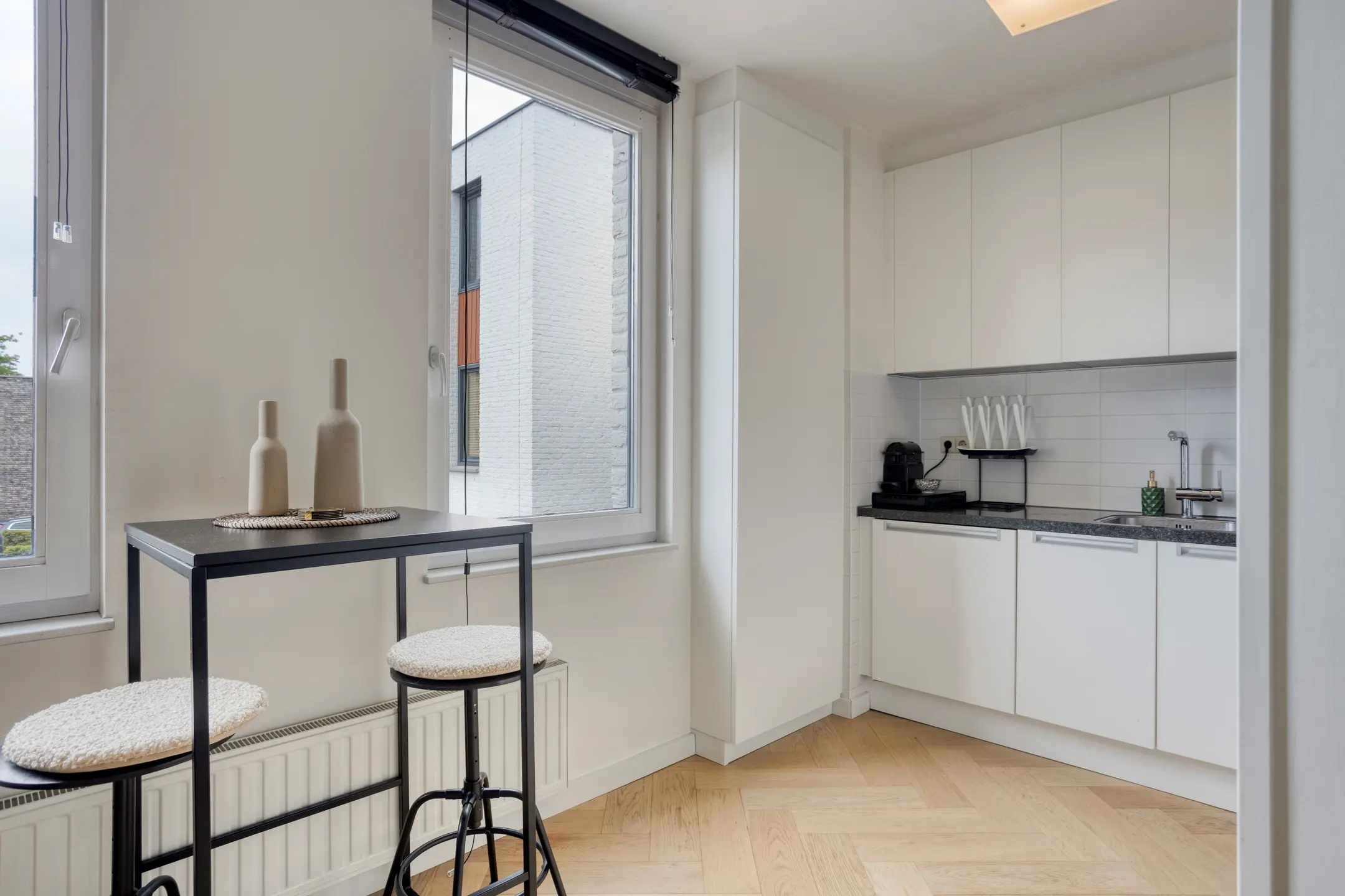 De overloop biedt toegang tot de woonkamer met open keuken en trapopgang naar de 2e verdieping.
