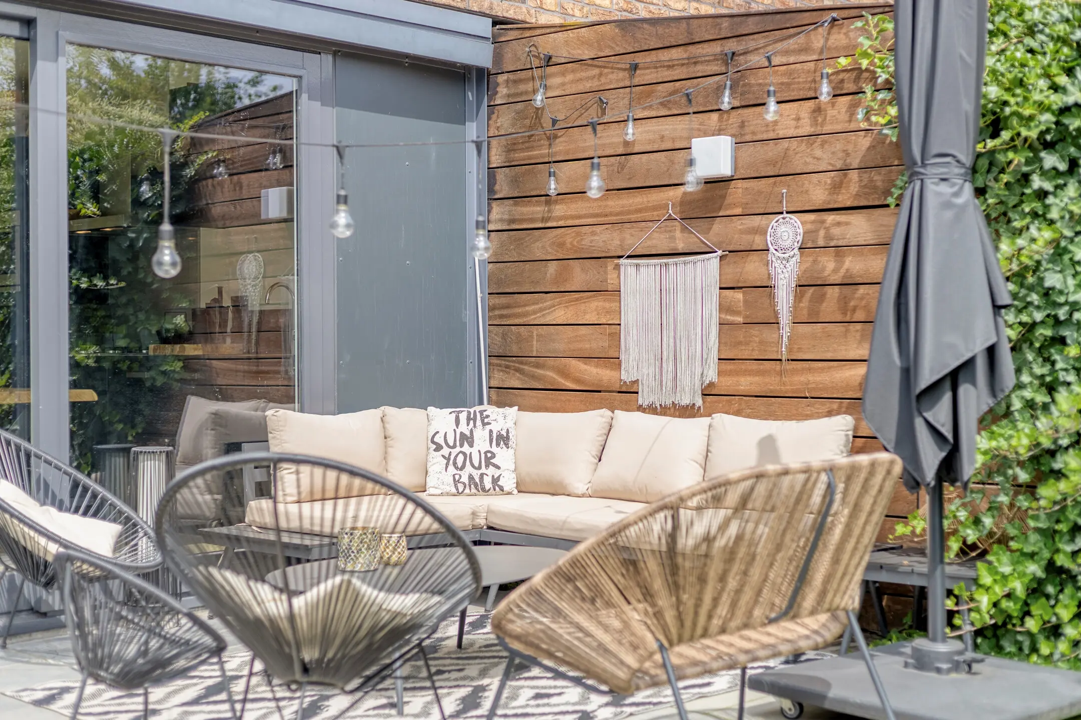 Een grote schuifpui biedt toegang tot de achtertuin die aan het water ligt.